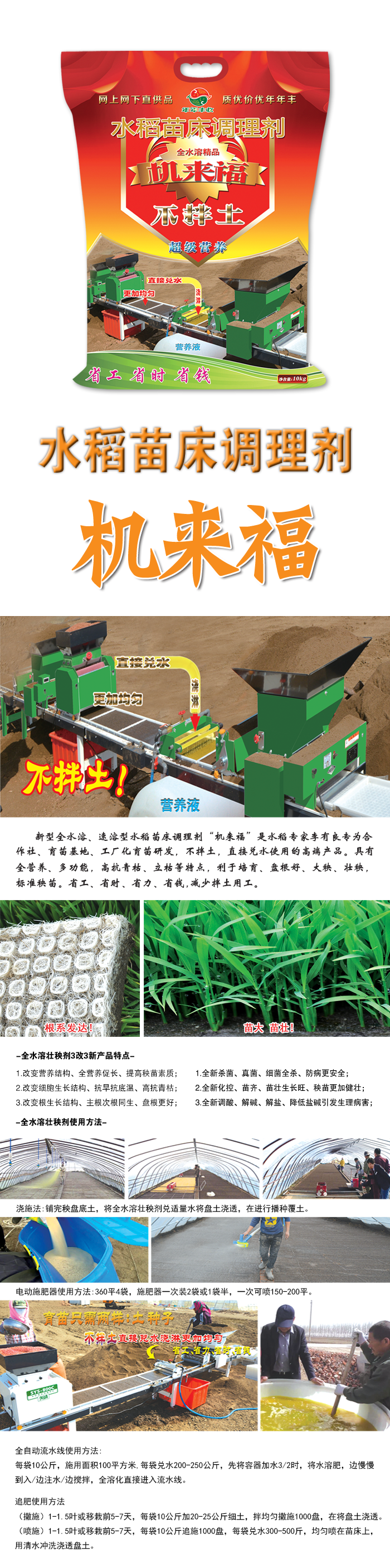 新型全水溶、速溶型水稻苗床調理劑“機來福”是水稻專家李有良專為合作社、育苗基地、工廠化育苗、機插秧育苗研發,不拌土,直接兌水使用的高端產品。具有全營養、多功能,高抗青枯、立枯等特點,利于培育、大秧、壯秧、盤根好,標準秧苗省工、省時、省力、省錢,減少拌土用工,降低育苗成本,使用更加方便。