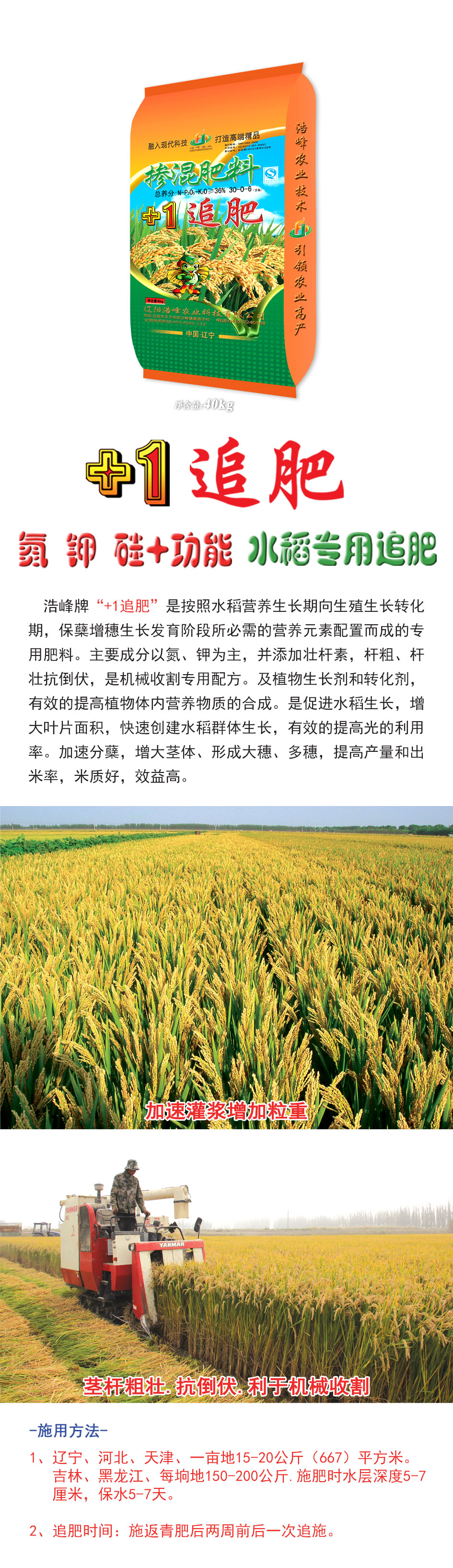 浩峰牌“+1追肥”是按照水稻營養生長期向生殖生長轉化期,保蘗增穗生長發育階段所必需的營養元素配置而成的專用肥料。主要成分以氮、鉀為主,并添加壯桿素,桿粗、桿壯抗倒伏,是機械收割專用配方。及植物生長劑和轉化劑,有效的提高植物體內營養物質ず銑傘J譴俳舊ぃ齟笠鍍婊燜俅唇ㄋ救禾逕ぃ行У奶岣吖獾睦寐省<鈾俜洲粒齟缶ヌ濉⑿緯紗笏搿⒍嗨耄岣卟亢統雒茁剩字屎茫б娓摺?